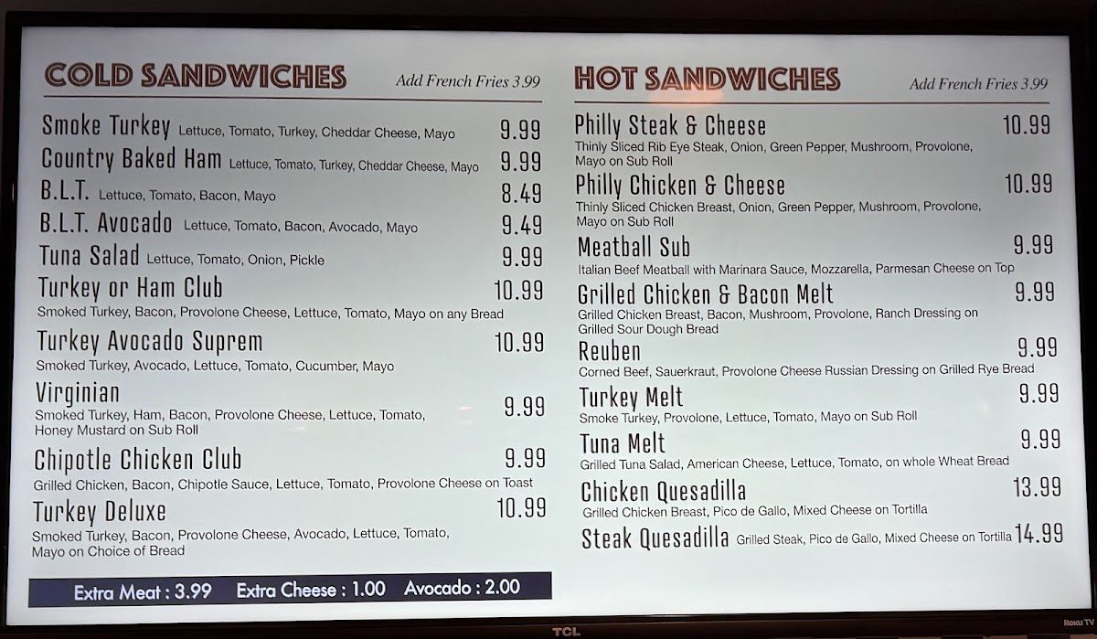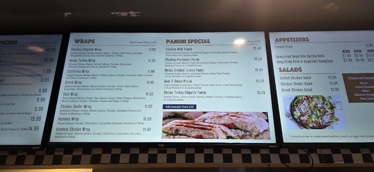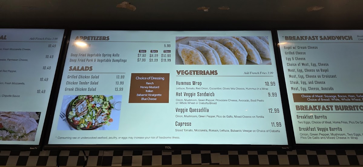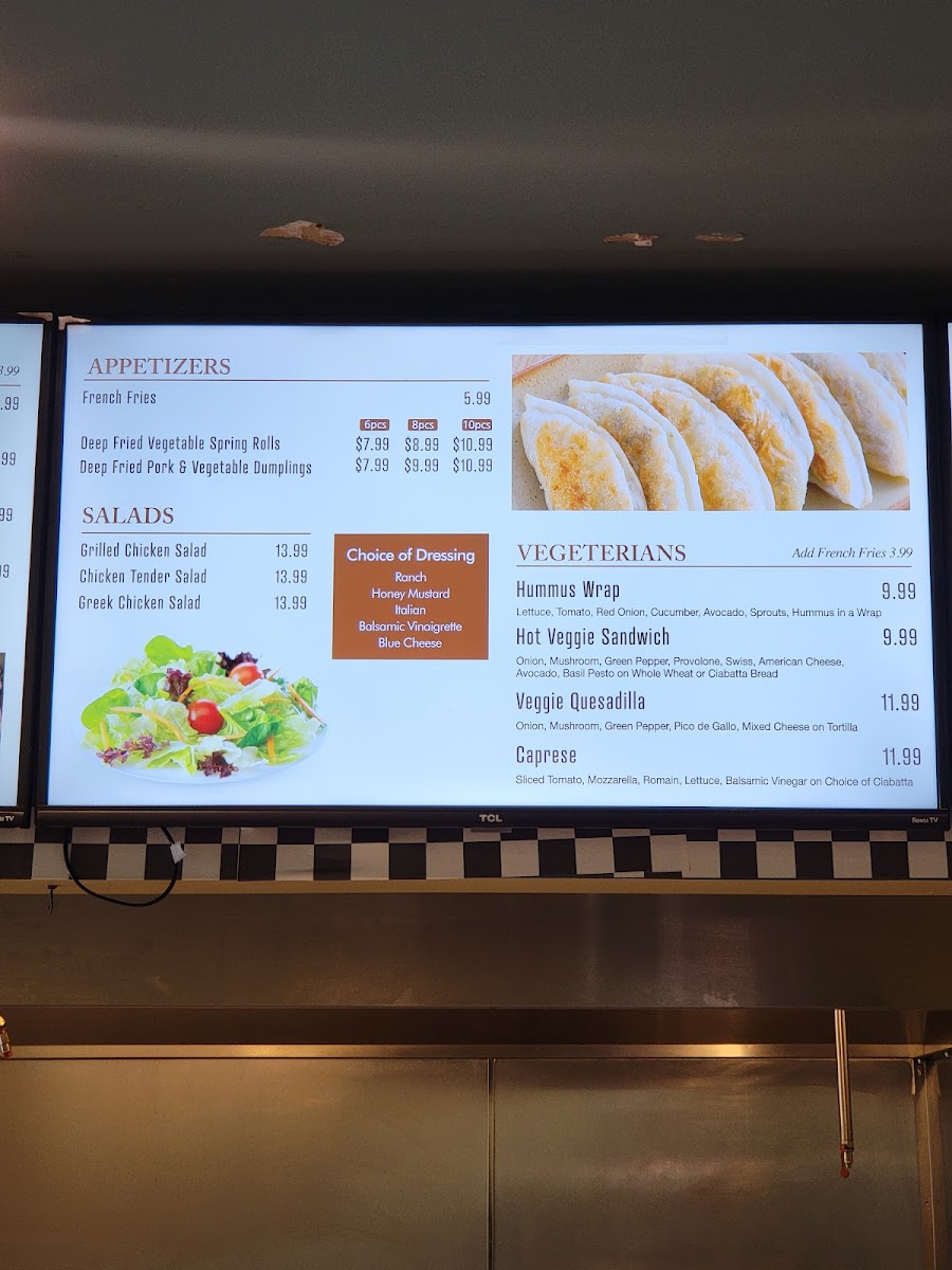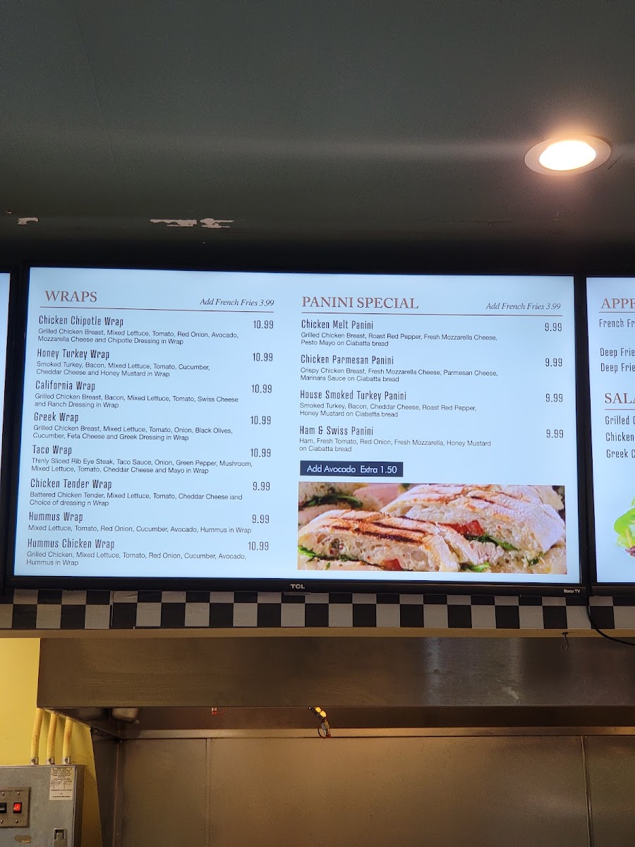 Salads feature choices such as regular salads, salads with added meat, and a chicken salad, offering lighter meal alternatives.