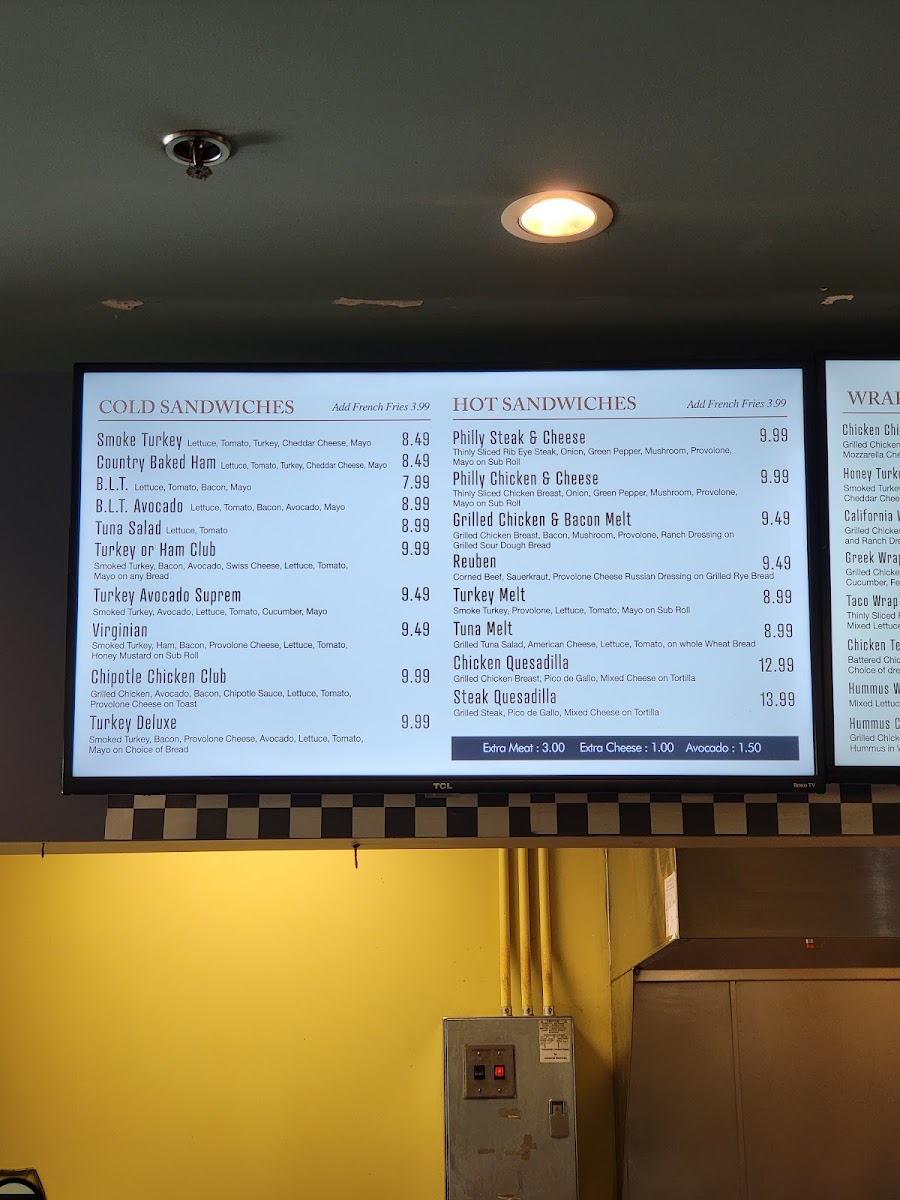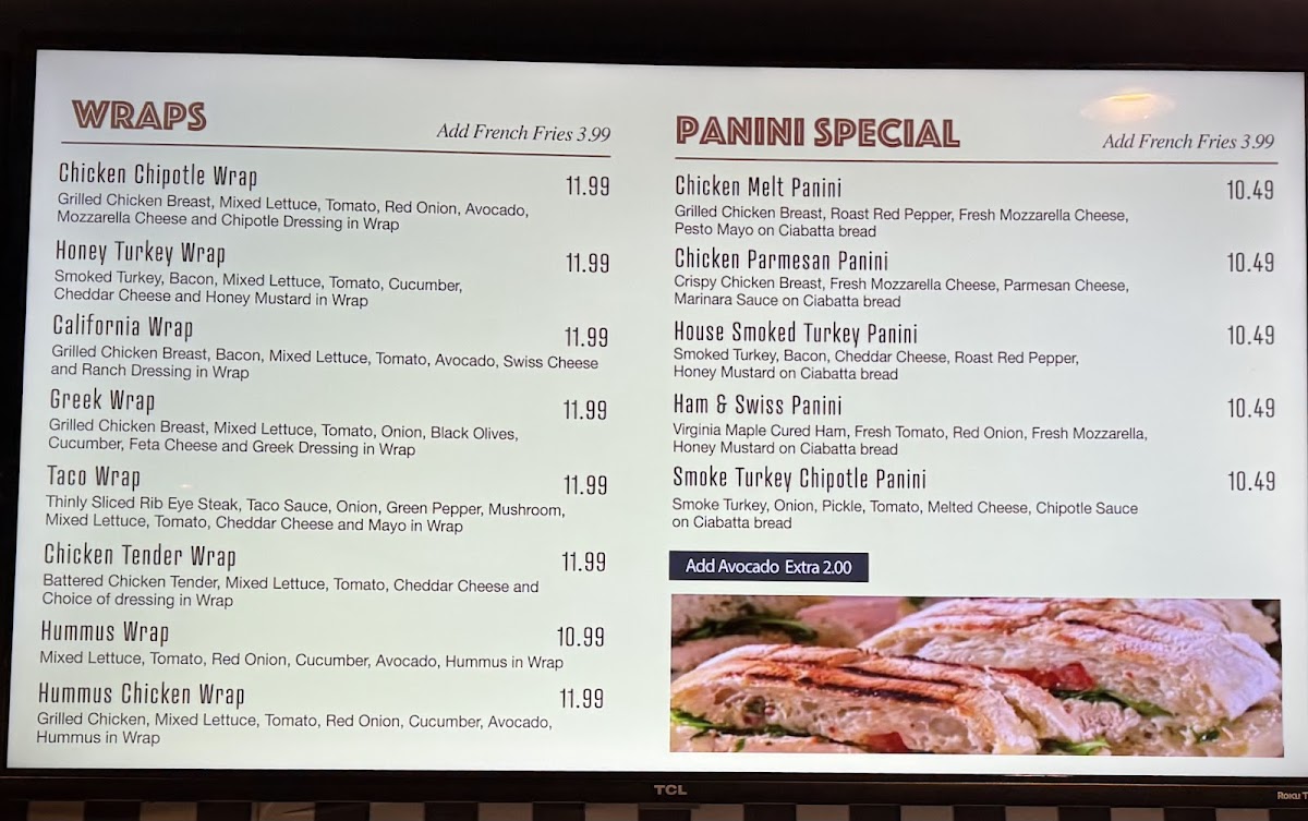 Lunch Menu selections consist of daily specials alongside a range of sandwiches and wraps. Notable items include Philly sandwiches, Reuben, tuna melt, turkey melt, meatball sub, panini, veggie sandwich, and a variety of wrap sandwiches such as the hummus wrap and the BLT avocado. This category is designed for quick, casual meals with options for meat and vegetarian preferences.